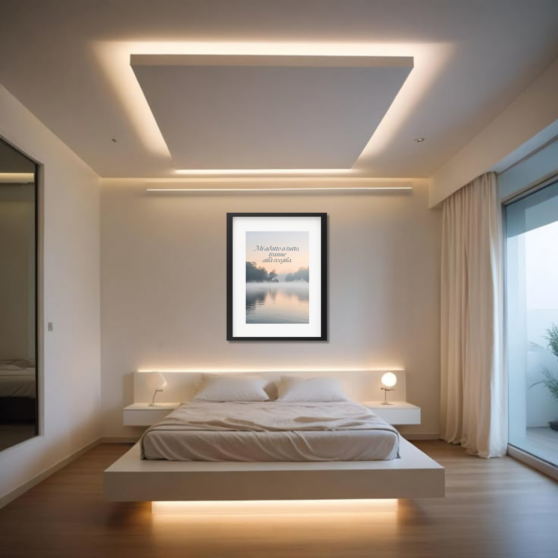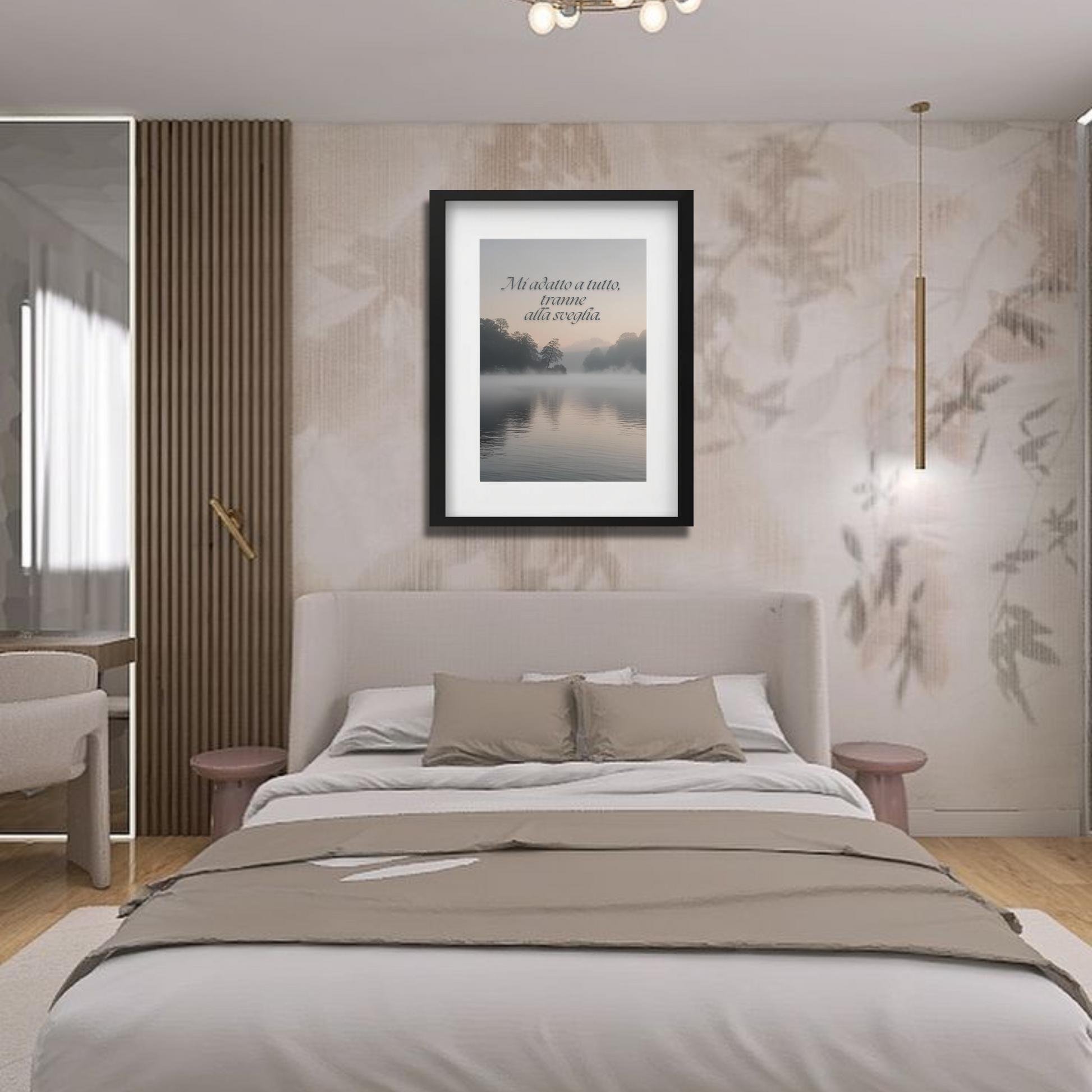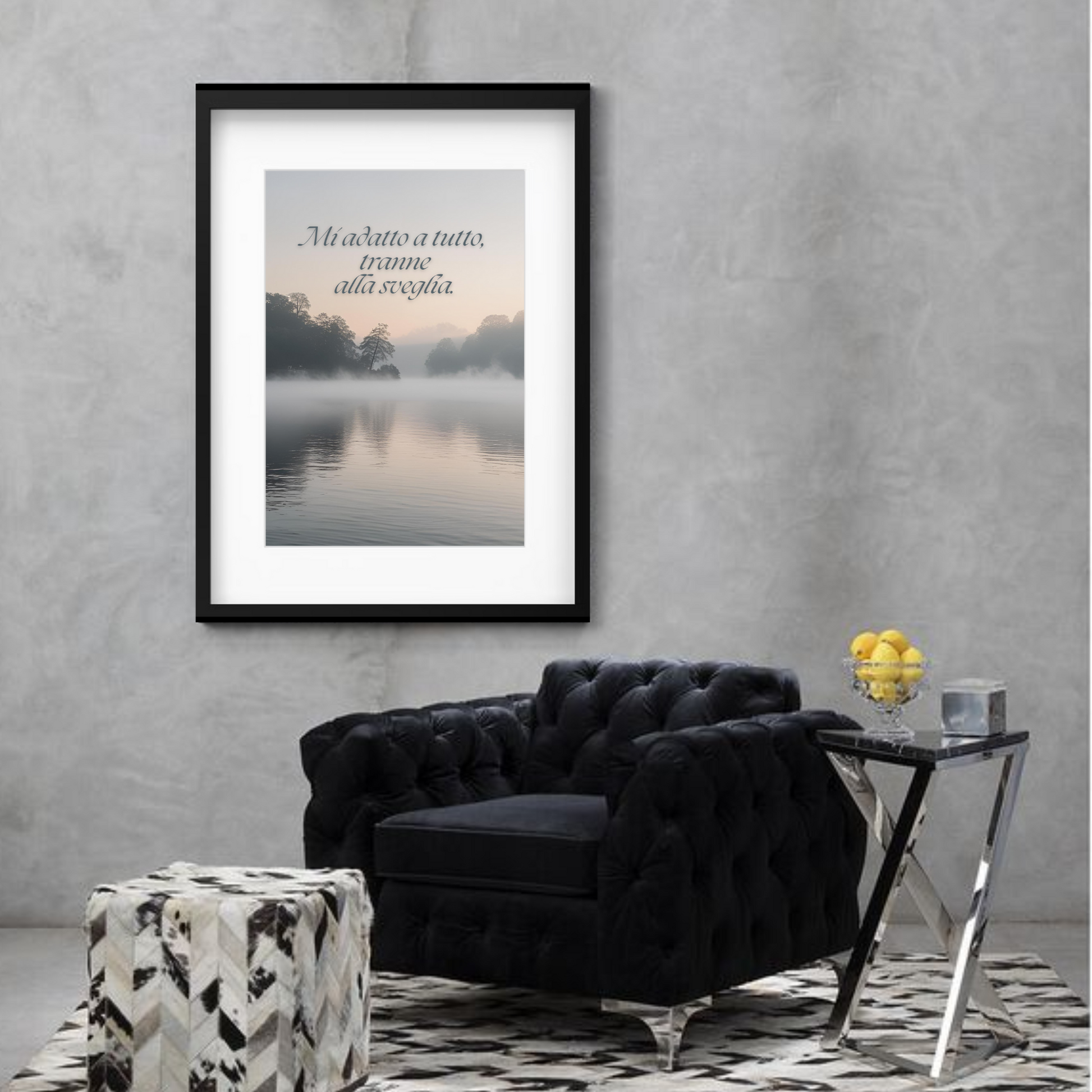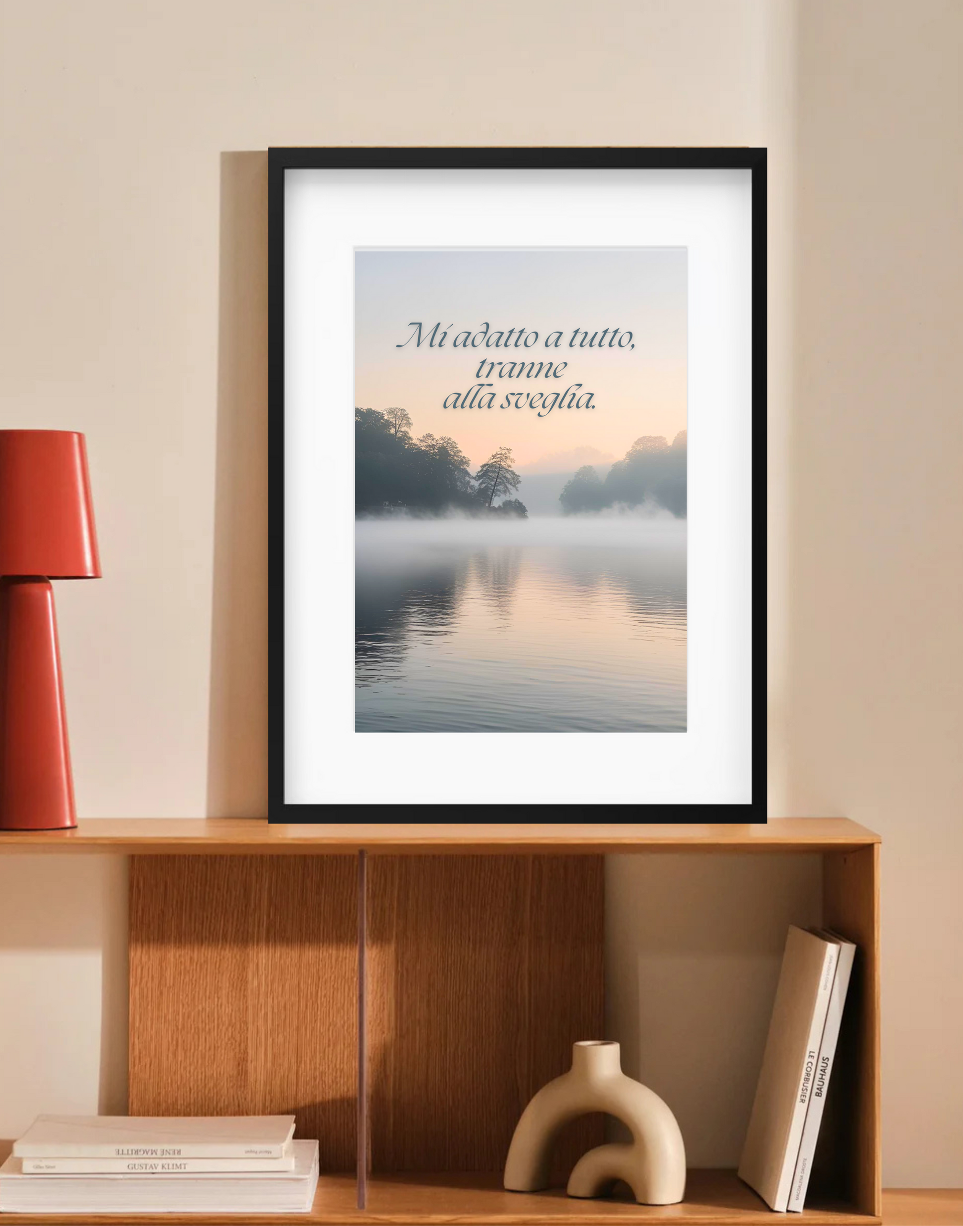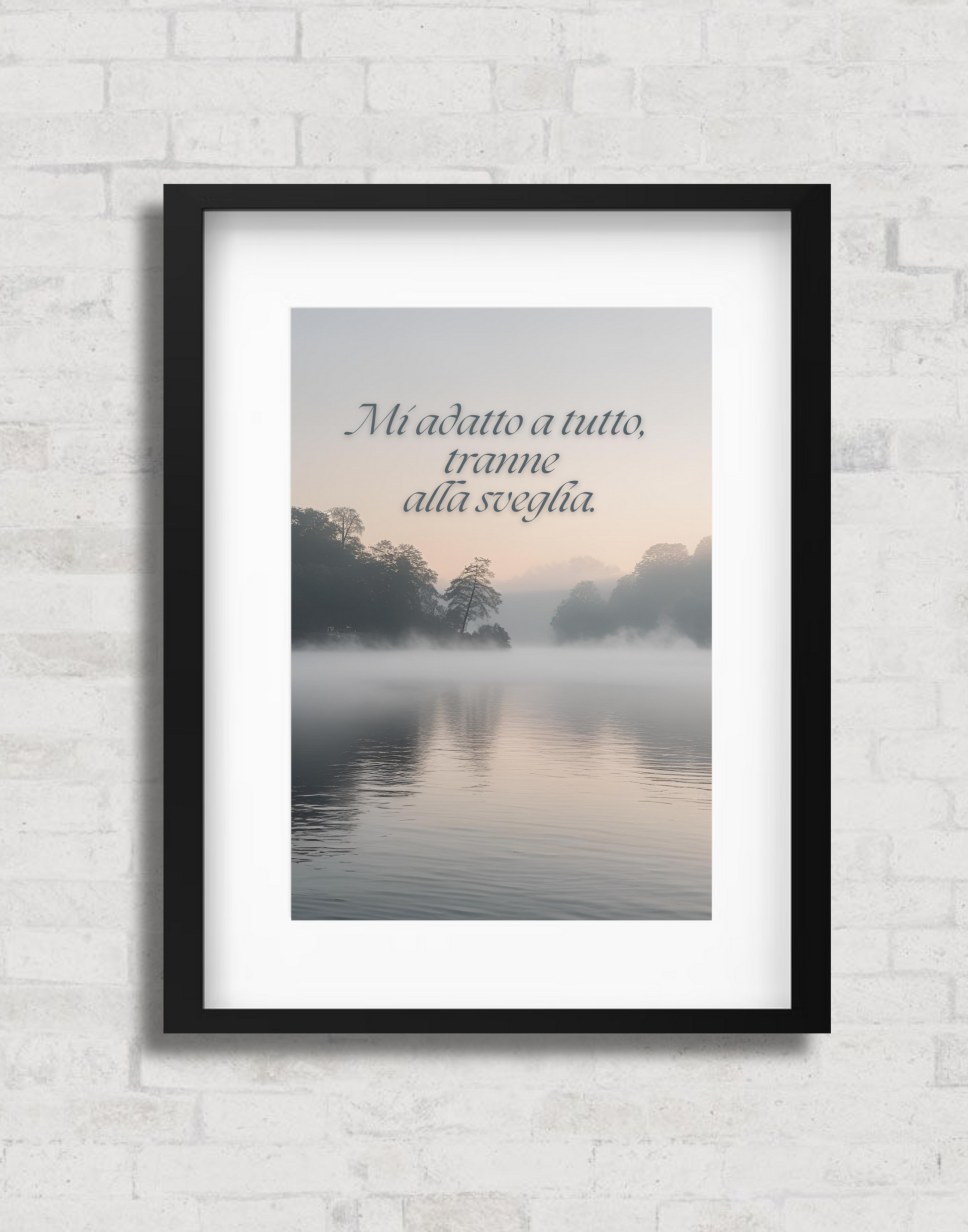 Questo quadro con cornice nera elegante presenta al centro la scritta "Mi adatto a tutto, tranne alla sveglia", un messaggio ironico e originale che cattura l’attenzione. Perfetto per aggiungere un tocco di personalità e umorismo a qualsiasi ambiente.
