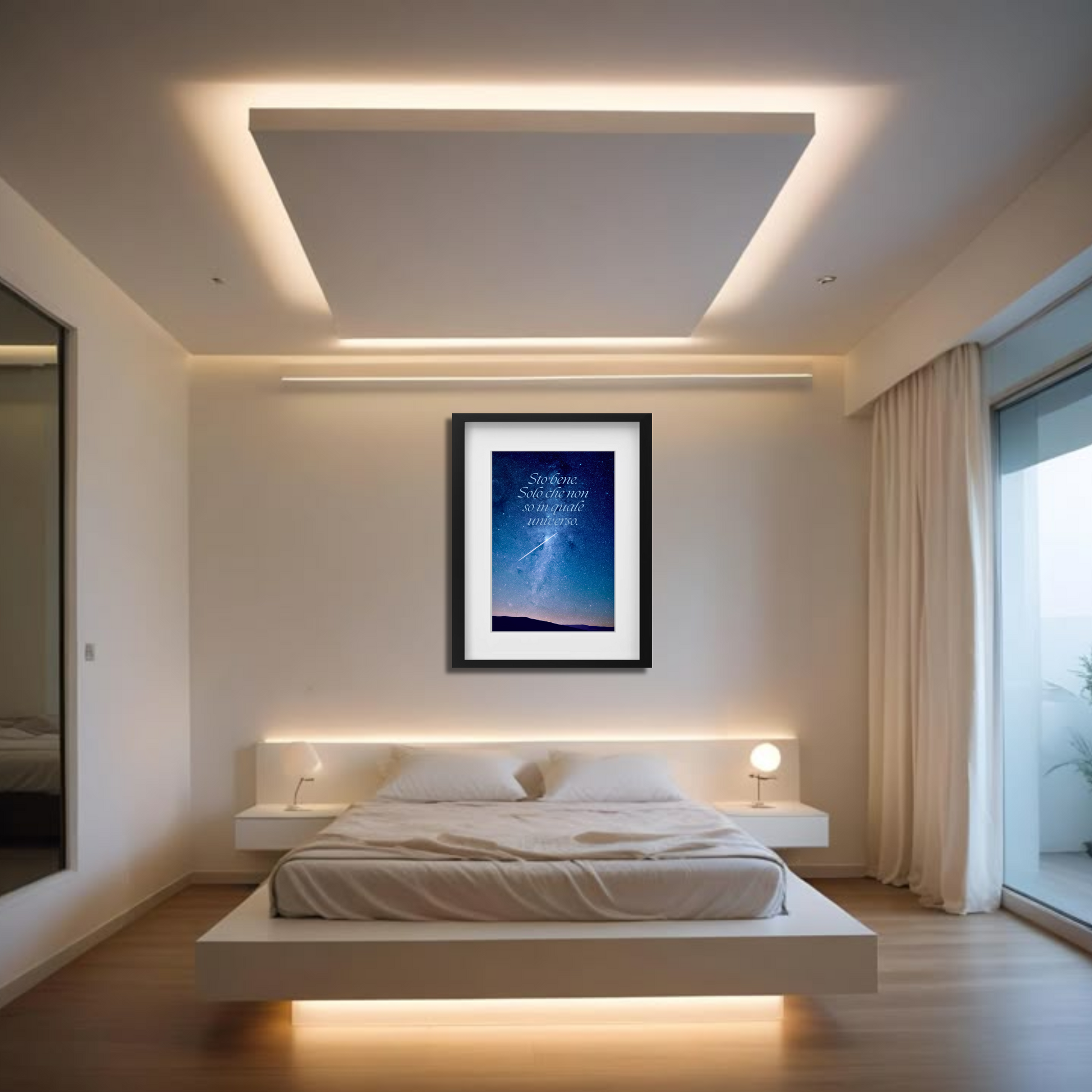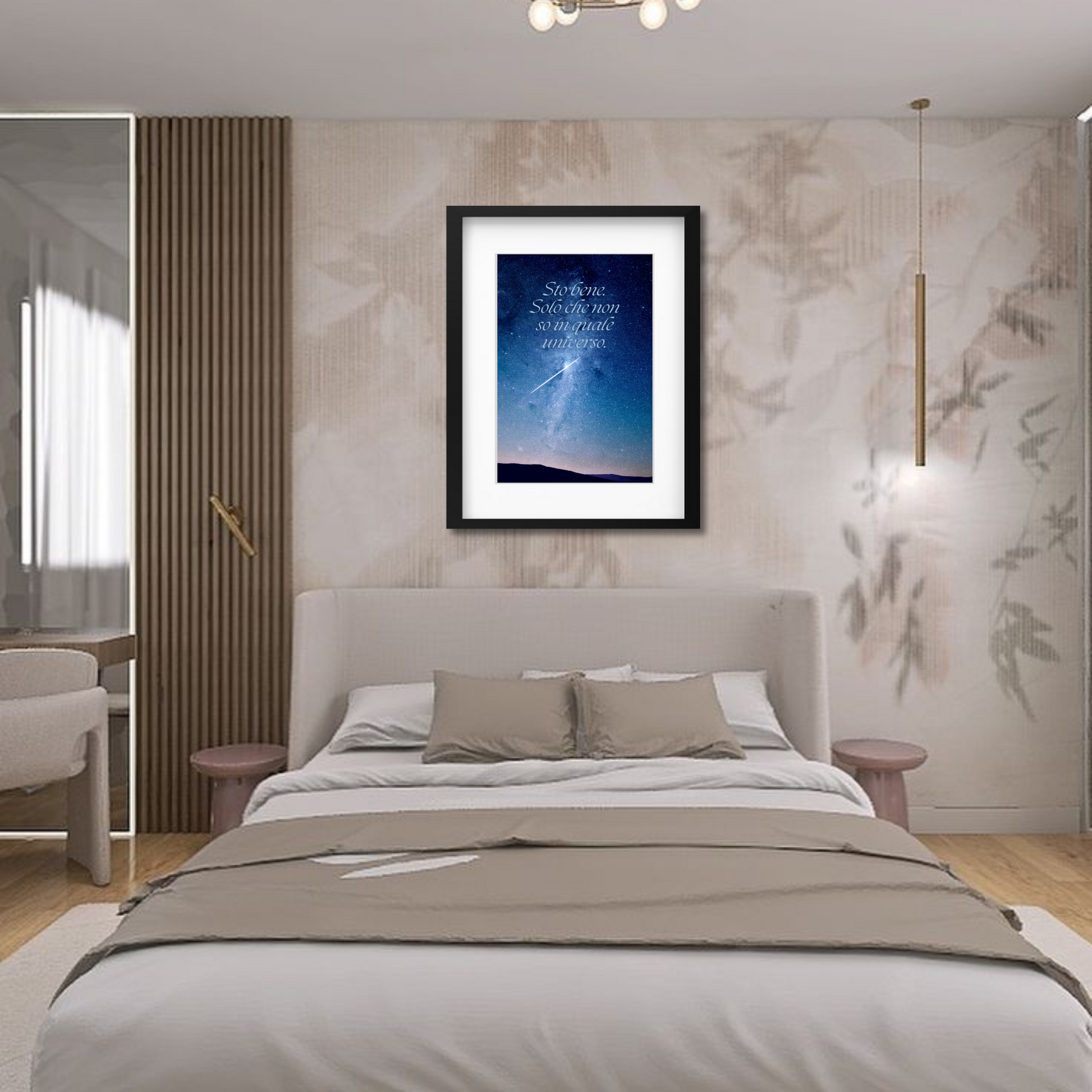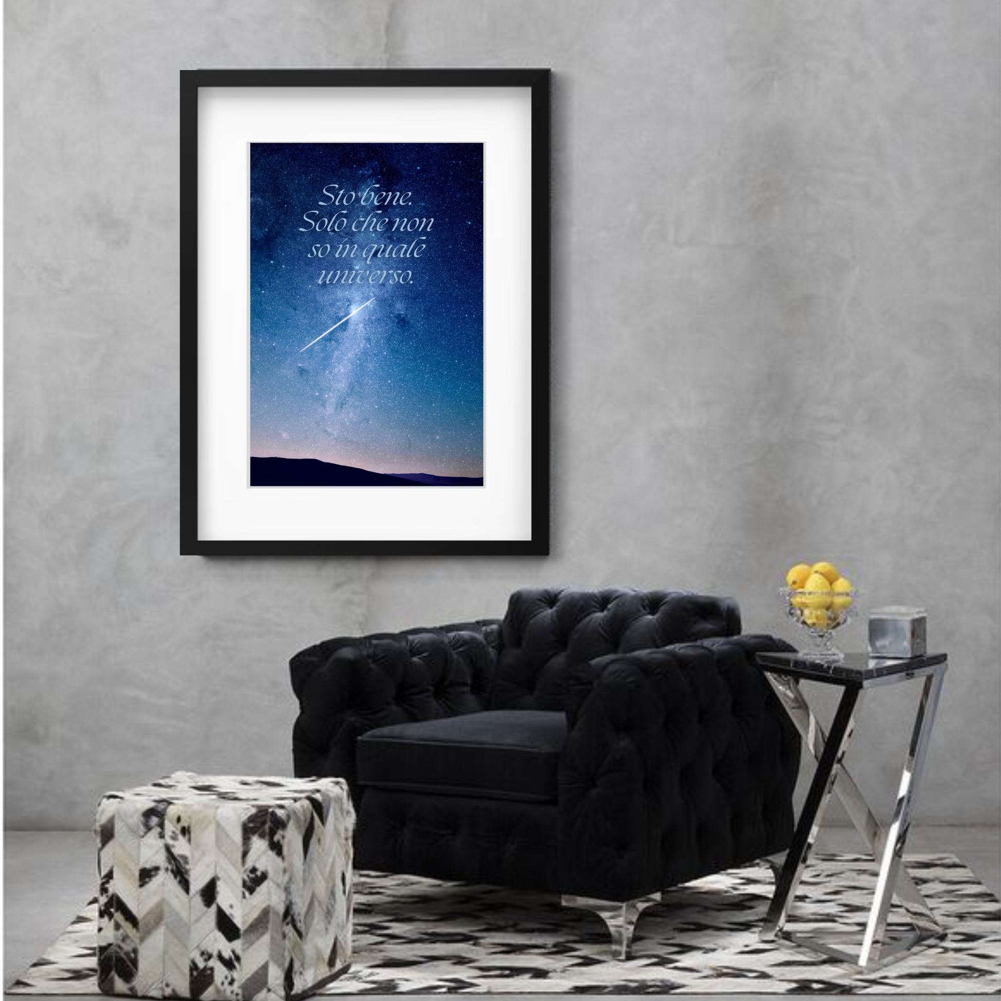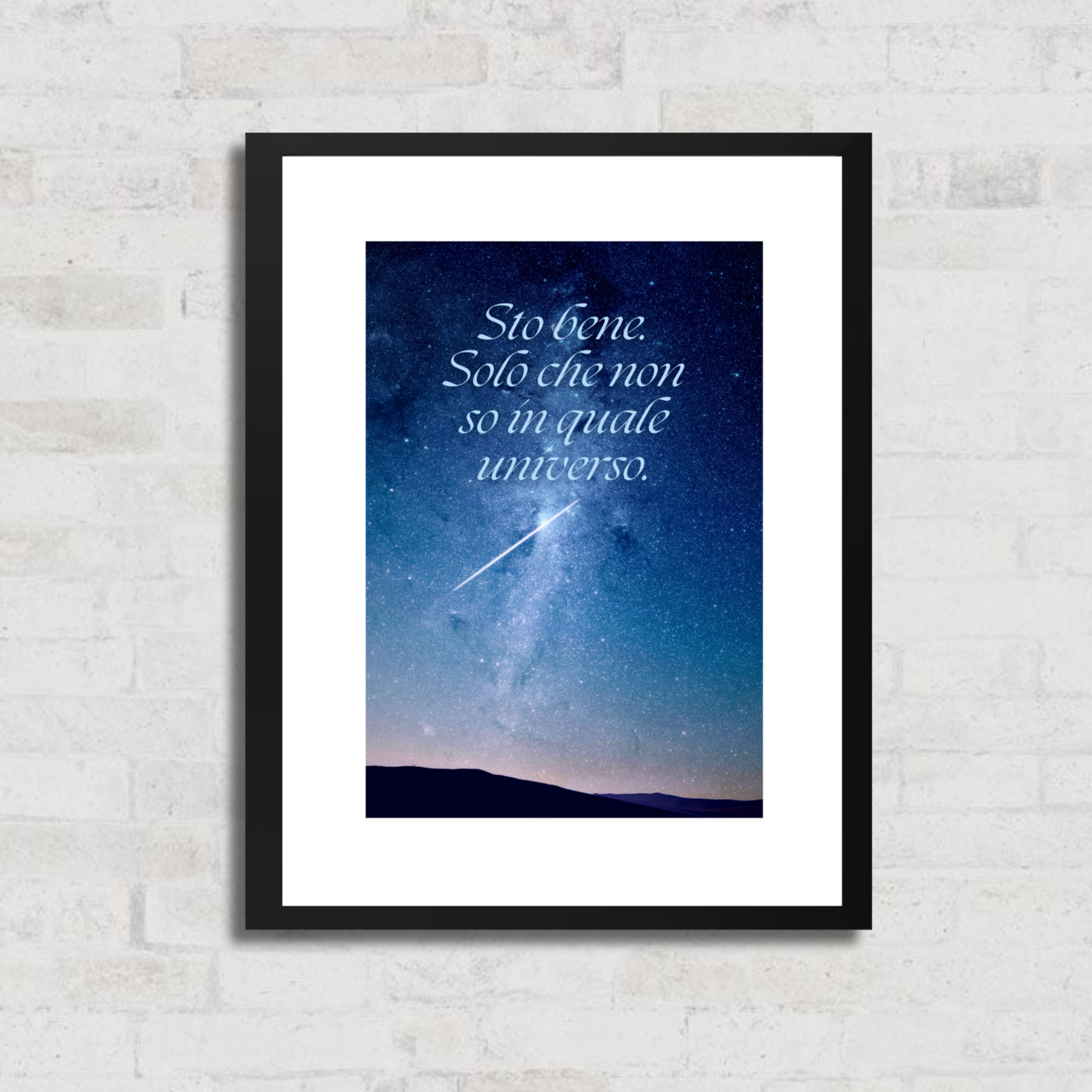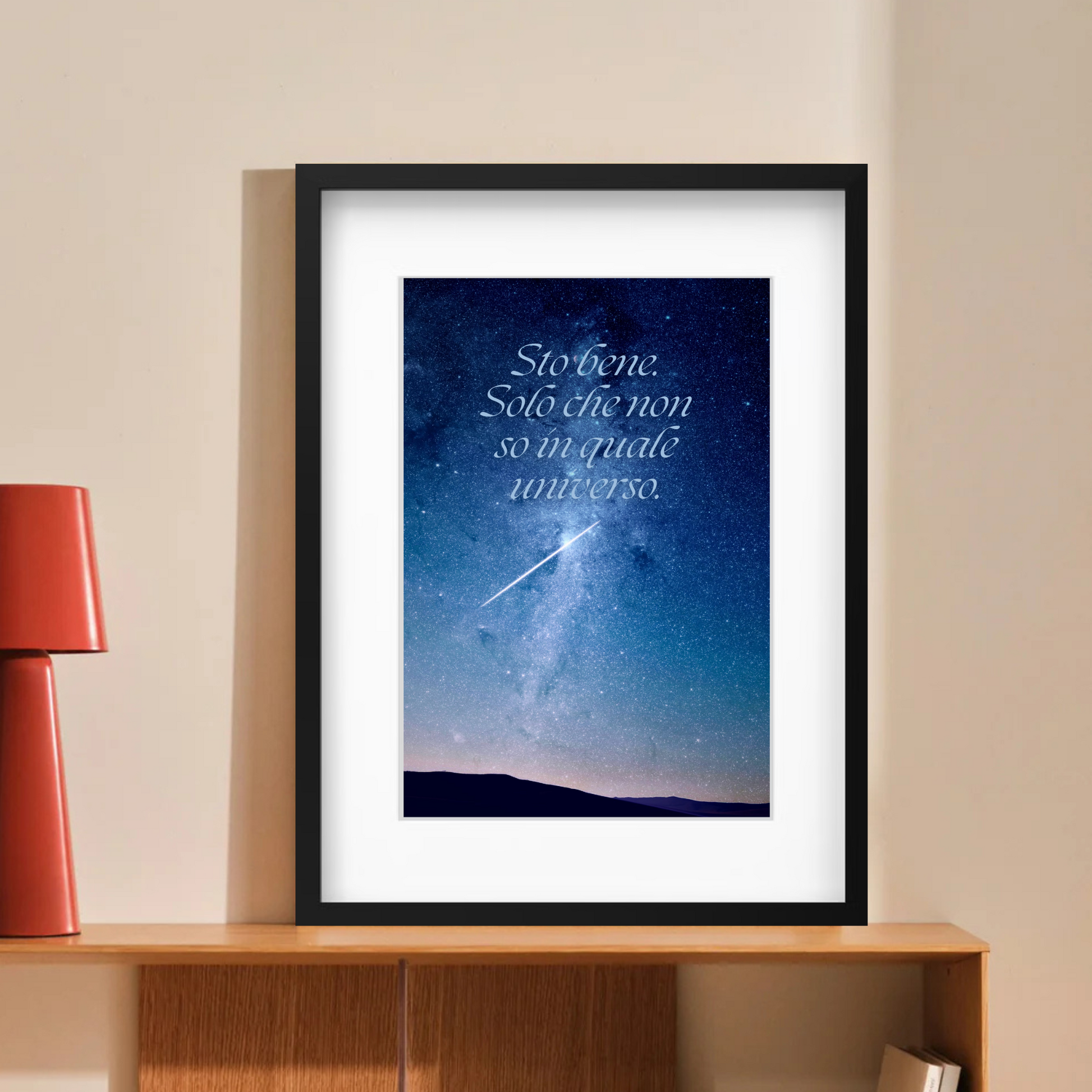 Questo quadro con cornice nera elegante presenta al centro la frase "Sto bene. Ma non so in quale universo.", un messaggio che invita alla riflessione e aggiunge un tocco di originalità a qualsiasi ambiente.