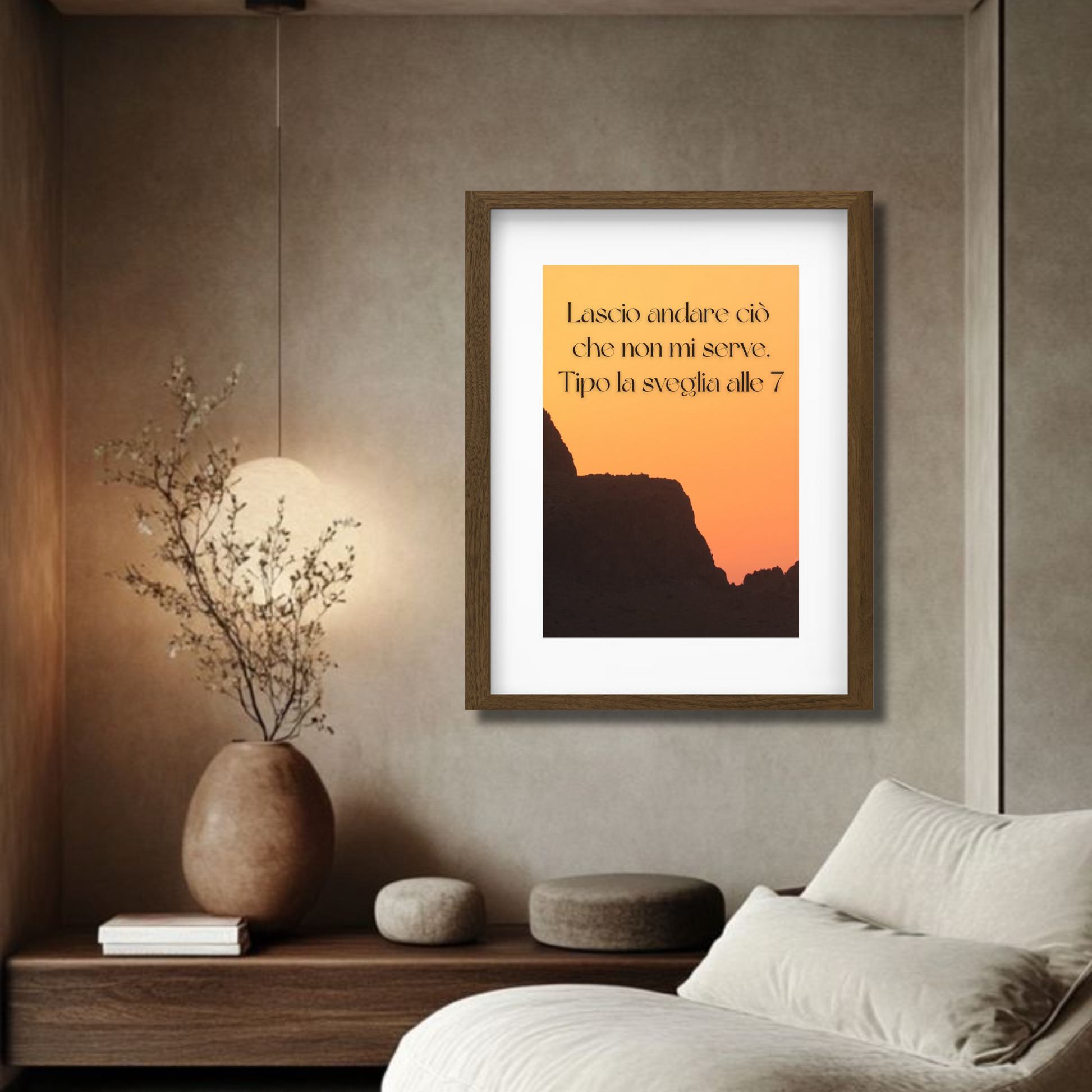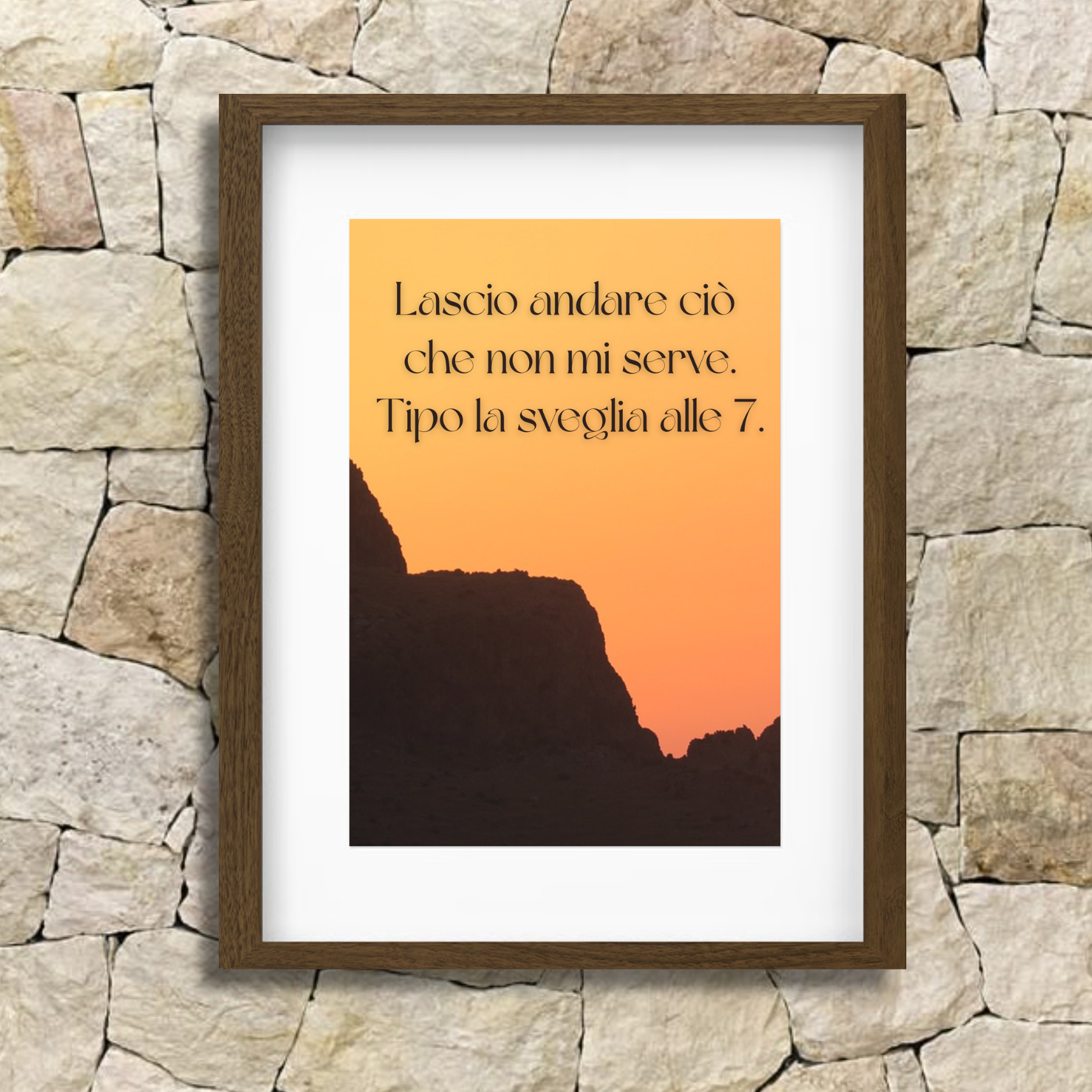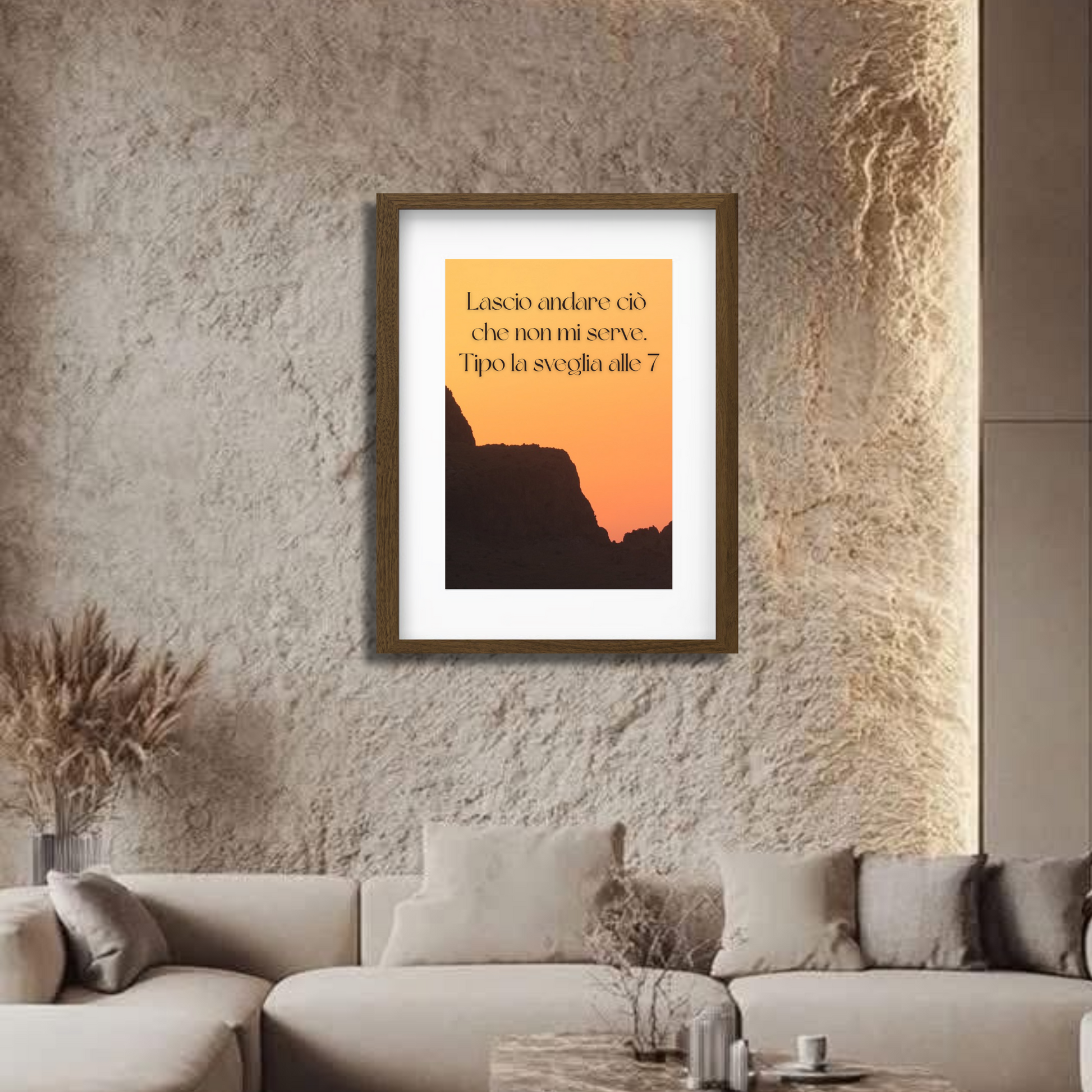 Questo quadro con cornice marrone e scritta ironica “Lascio andare ciò che non mi serve. Tipo la sveglia alle 7” è perfetto per chi desidera portare in casa un messaggio di leggerezza e libertà, invitando a vivere senza stress e a godersi ogni momento.
