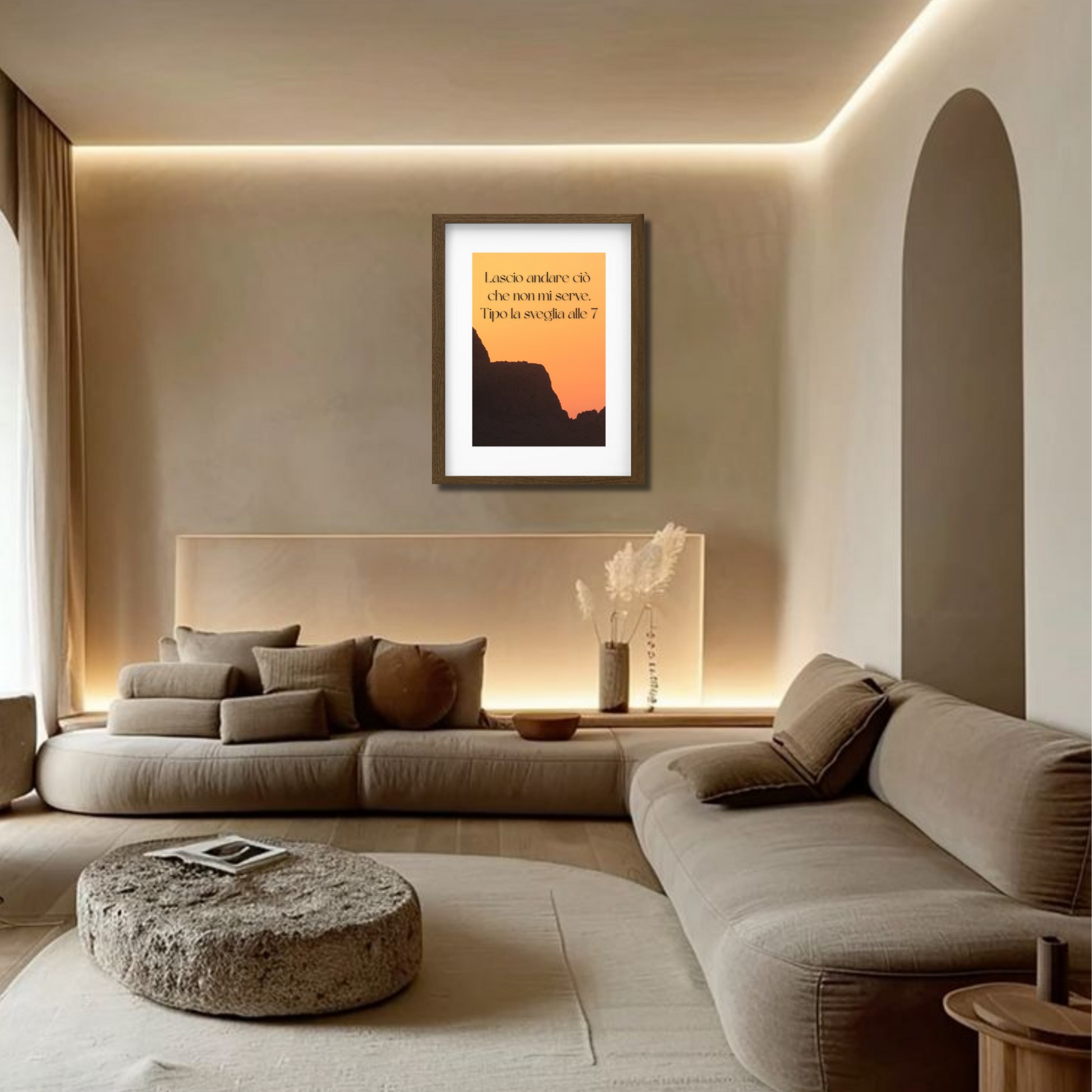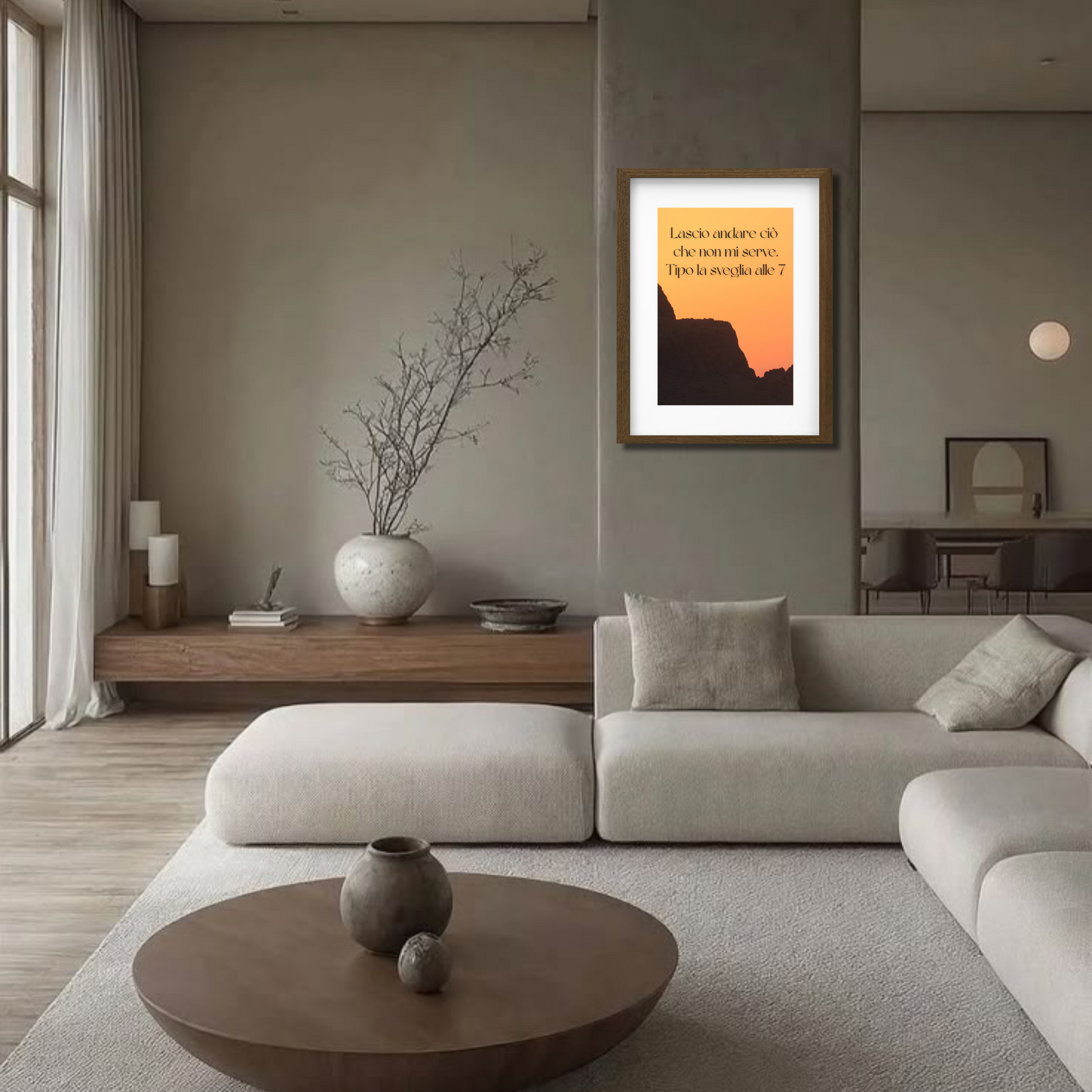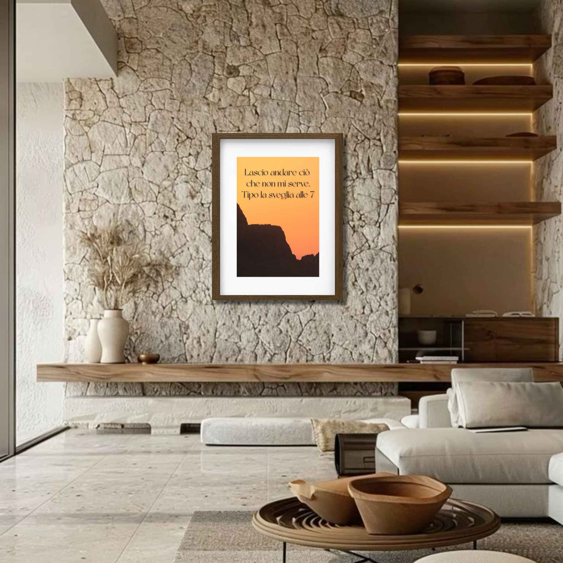 Questo quadro con cornice marrone e scritta ironica “Lascio andare ciò che non mi serve. Tipo la sveglia alle 7” è perfetto per chi desidera portare in casa un messaggio di leggerezza e libertà, invitando a vivere senza stress e a godersi ogni momento.