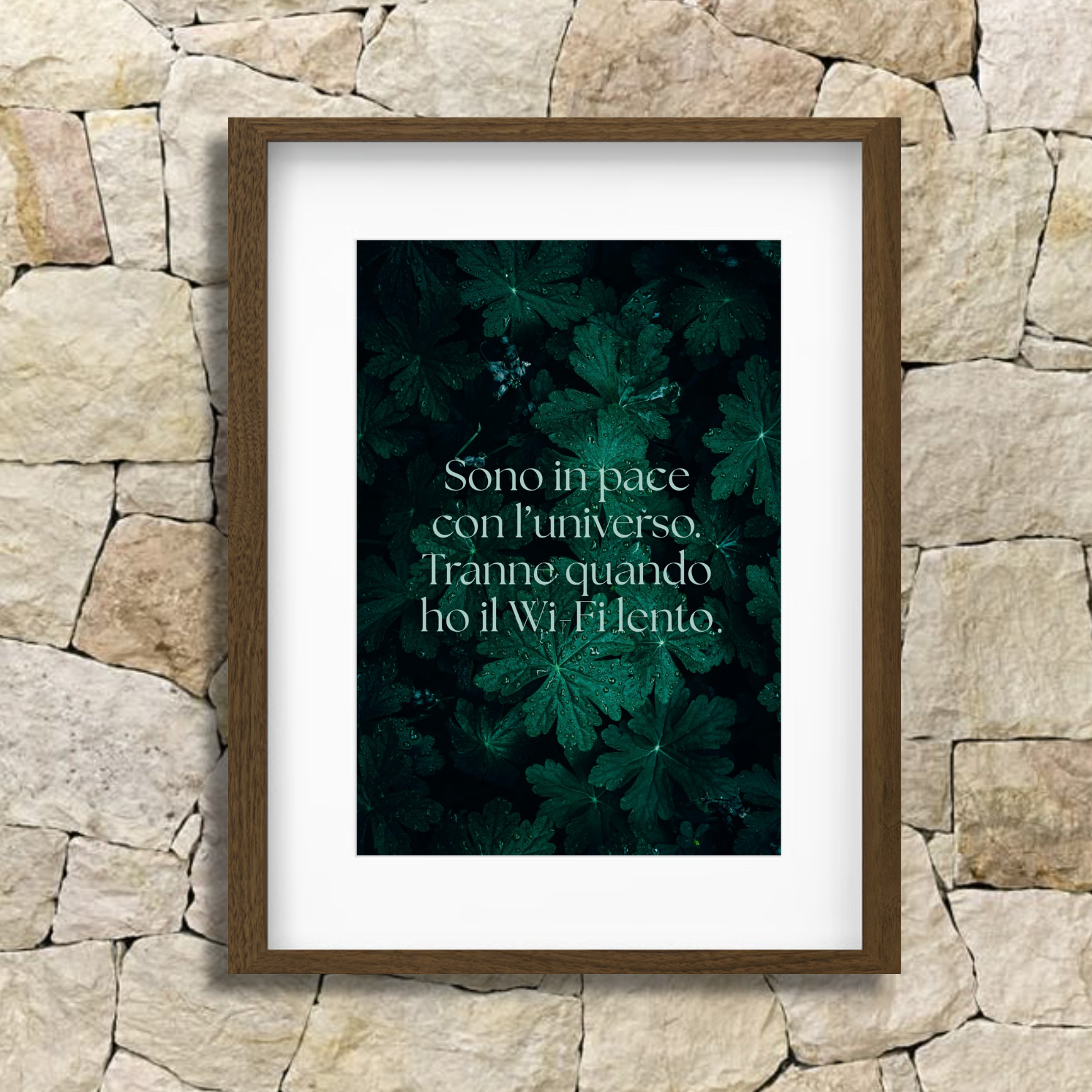 Questo quadro con cornice marrone, ha una scritta ironica e moderna al centro: "Sono in pace con l'universo tranne quando ho il WiFi lento." Perfetto per chi ama un tocco di umorismo nella propria casa o ufficio.