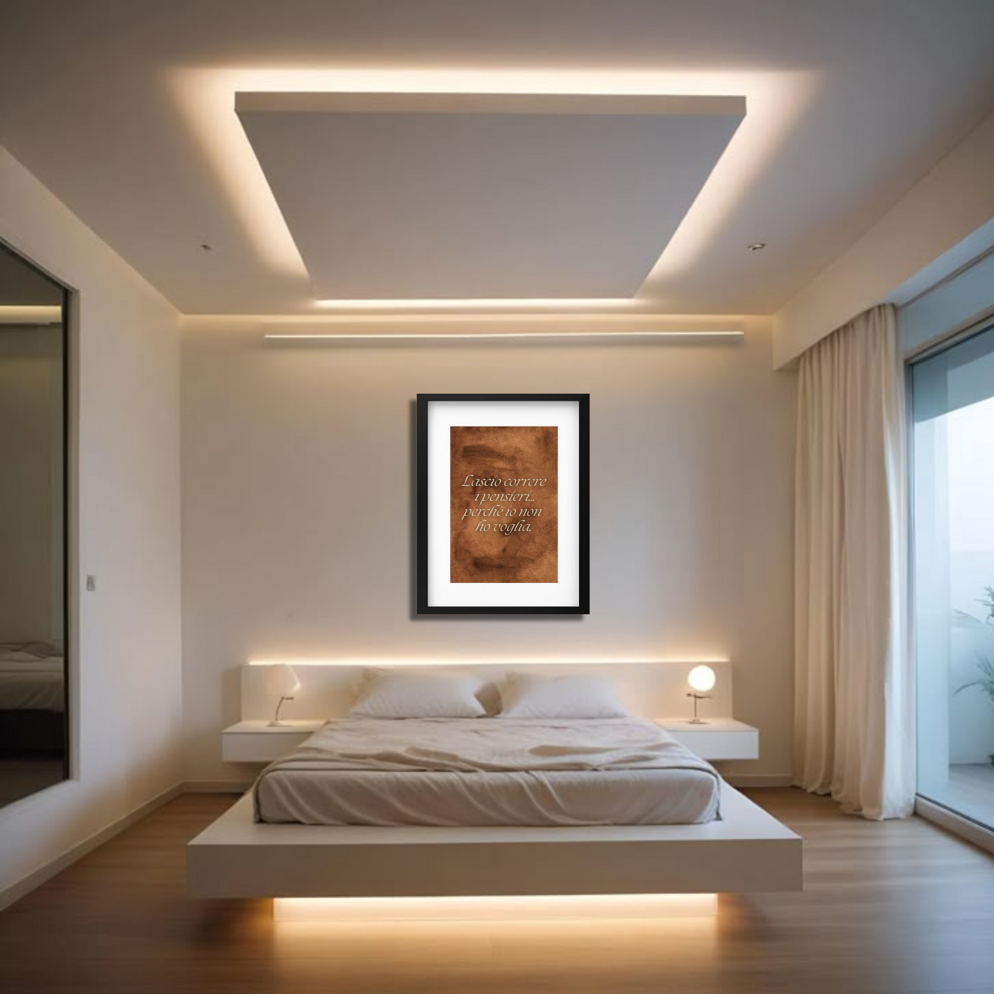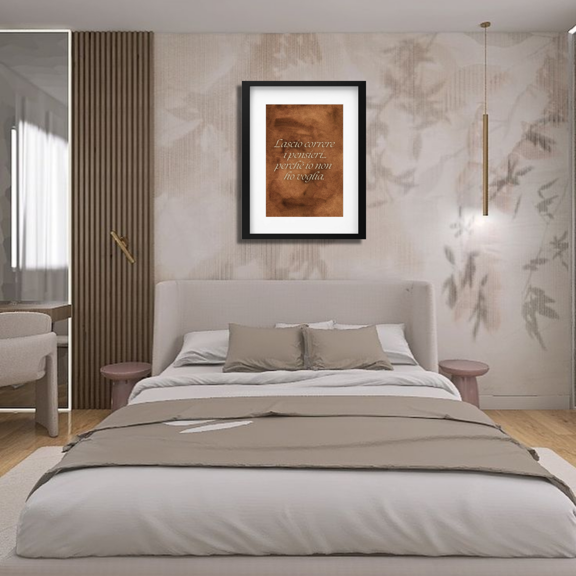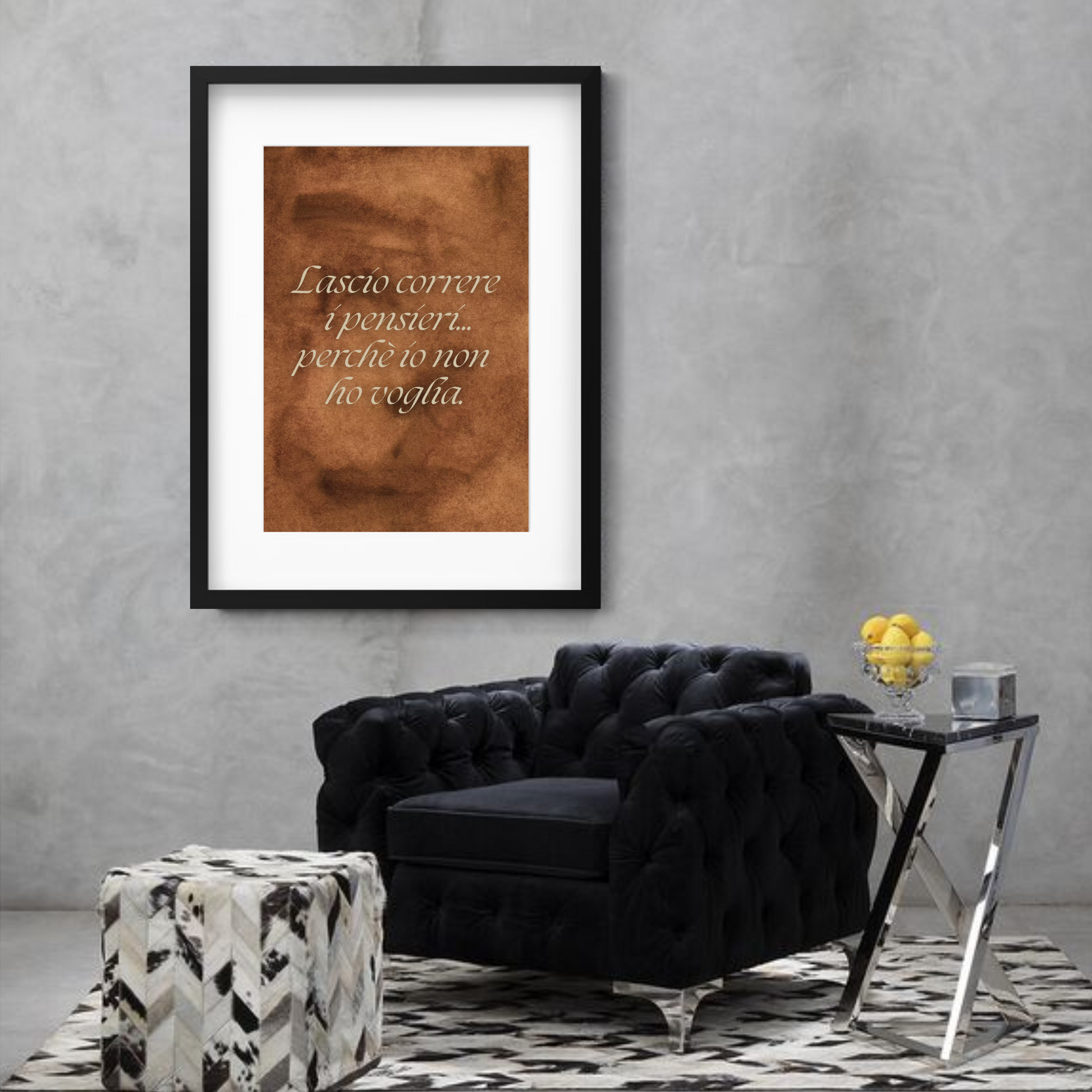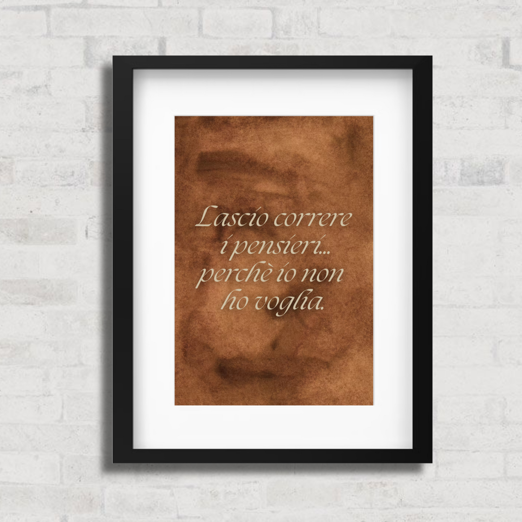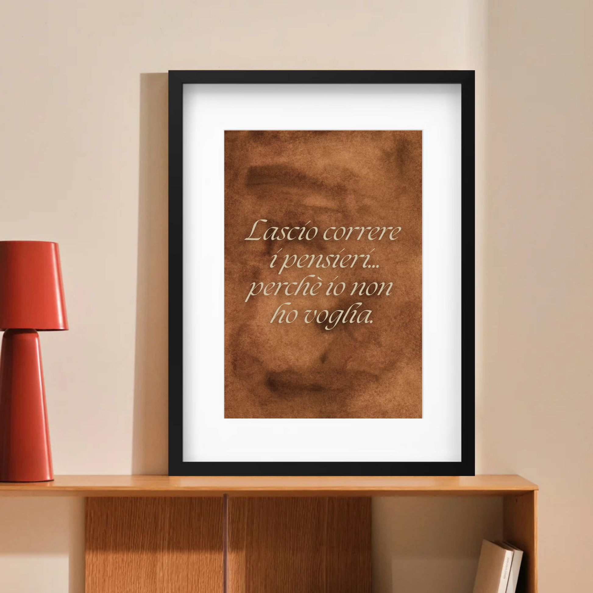 Questo quadro con cornice nera e una frase che cattura l’essenza del relax mentale: "Lascio correre i pensieri... perchè io non ho voglia." è perfetto per chi desidera un tocco di ironia e autenticità negli ambienti, invita a prendersi una pausa e a non prendersi troppo sul serio.